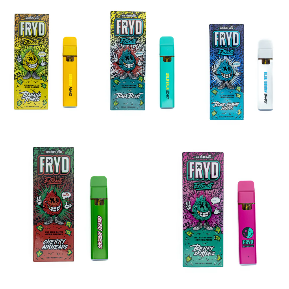 | Fryd Flavors | Baja Blast, Banana Runtz, Berry Zkittles, Blue Gummy Shark, Blueberry Slushee, Guava Gelato, Peach Rings, Pink Starburst, Strawberry Lemoncello, Watermelon Gusher |